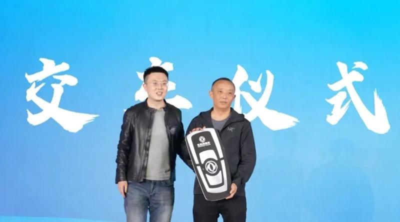 东风商用车营销事业部国内营销部部长刘畅现场向大客户费勇交付5台新能源牵引车,助力用户抢占绿色物流先机;